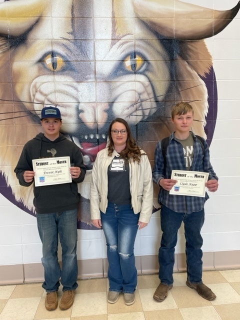 7th Grader Trevor Kyle and Freshman Clyde Kapp receiving an Amazon gift card by Andrea McNew from Shelter Insurance for demonstrating the character trait RESPECT.