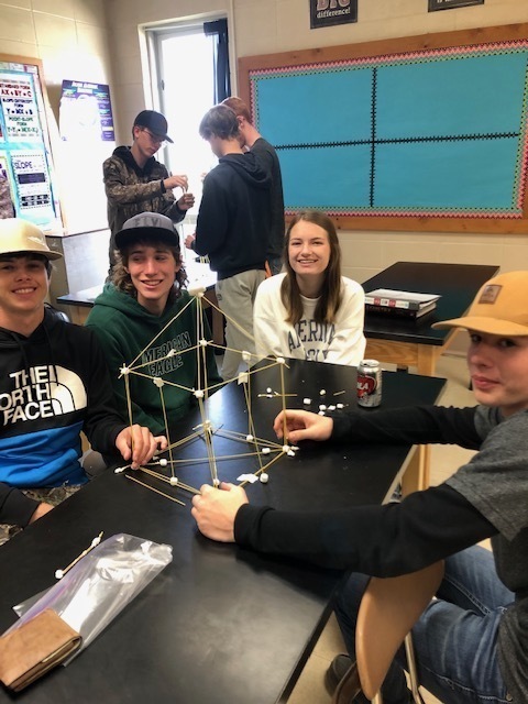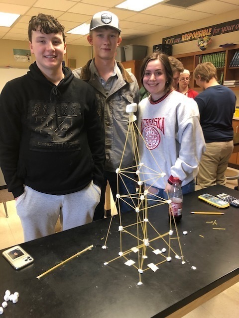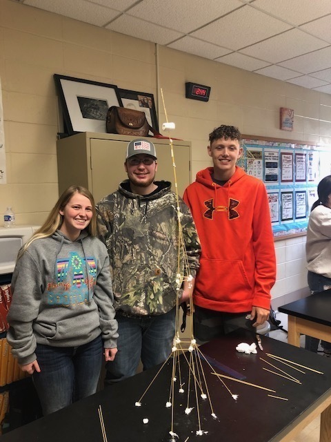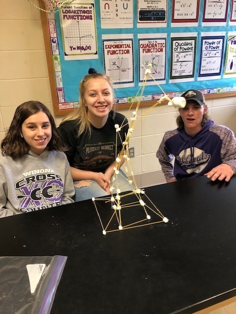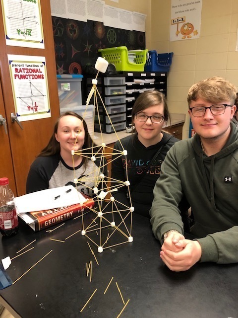 Geometry students used spaghetti and marshmallows to see who could build the tallest spaghetti tower that would support a large marshmallow. Towers were measured from the top of the marshmallow to the bottom of the tower. The winning tower was 40 inches! Check these out. The winning tower created and built by Bayleigh Perkins, Ethan Pulliam and Blaine Cooper.