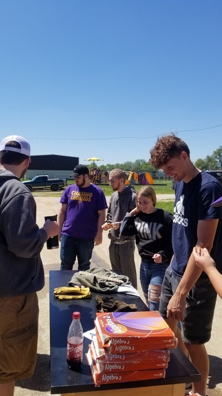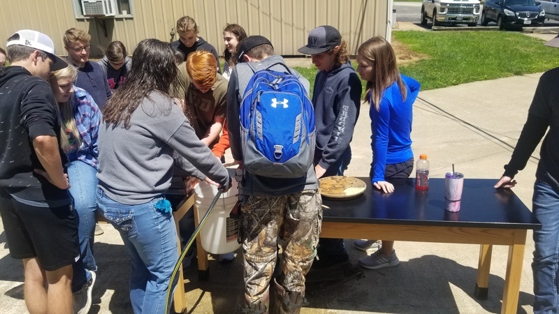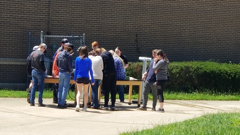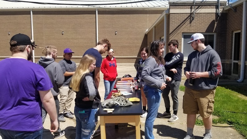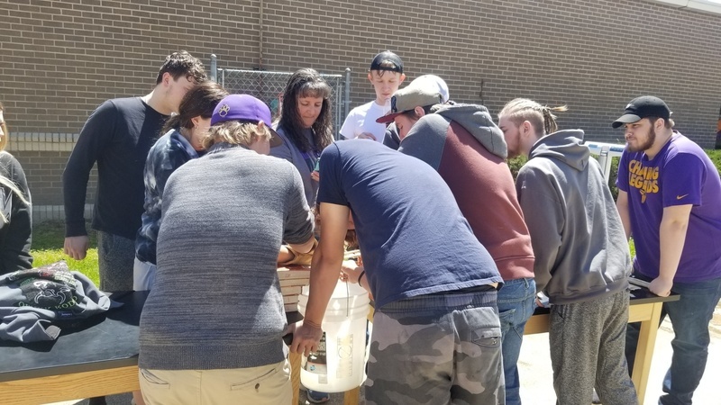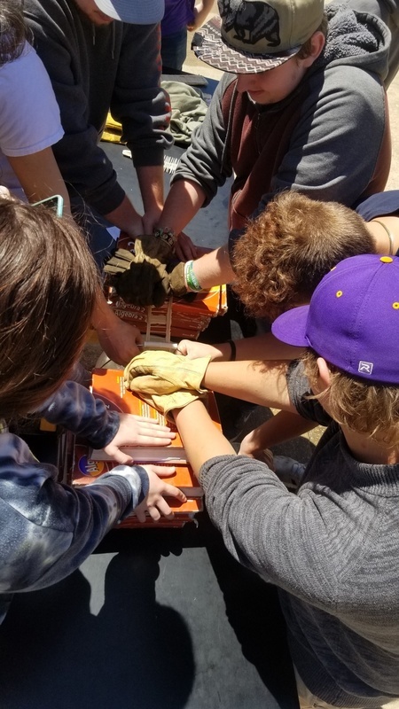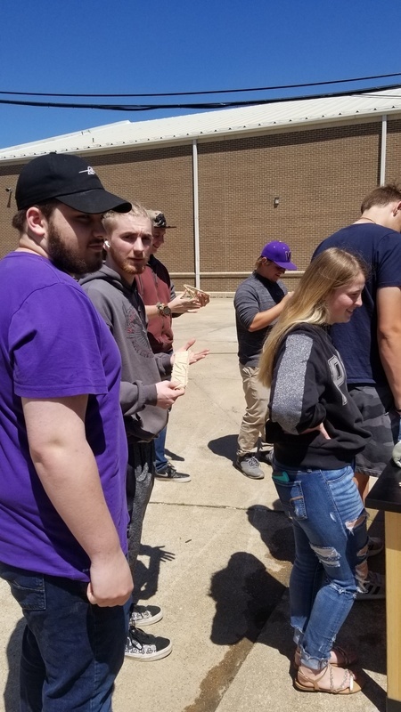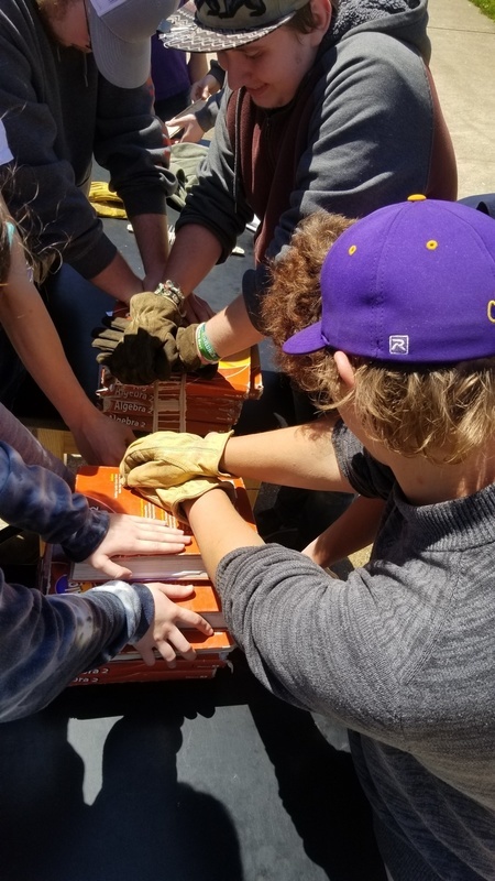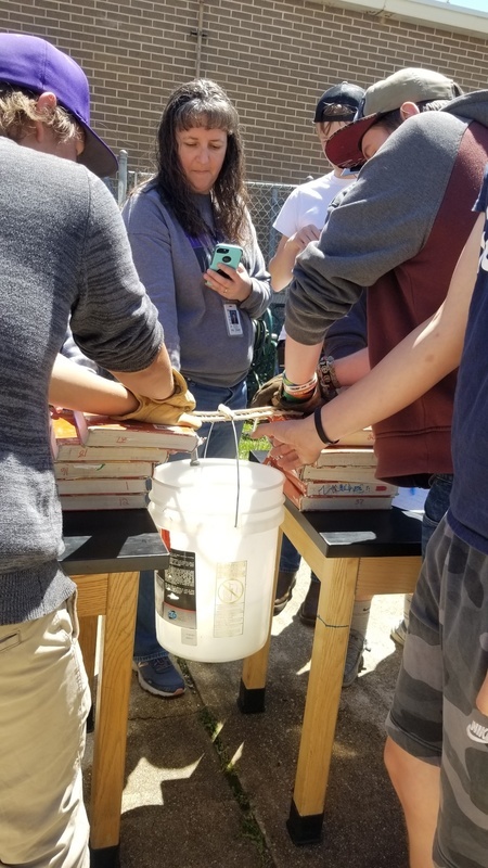 Mrs. Thacker and her math class calculating weights and measures. Testing handmade bridges to see how much weight they can withstand.